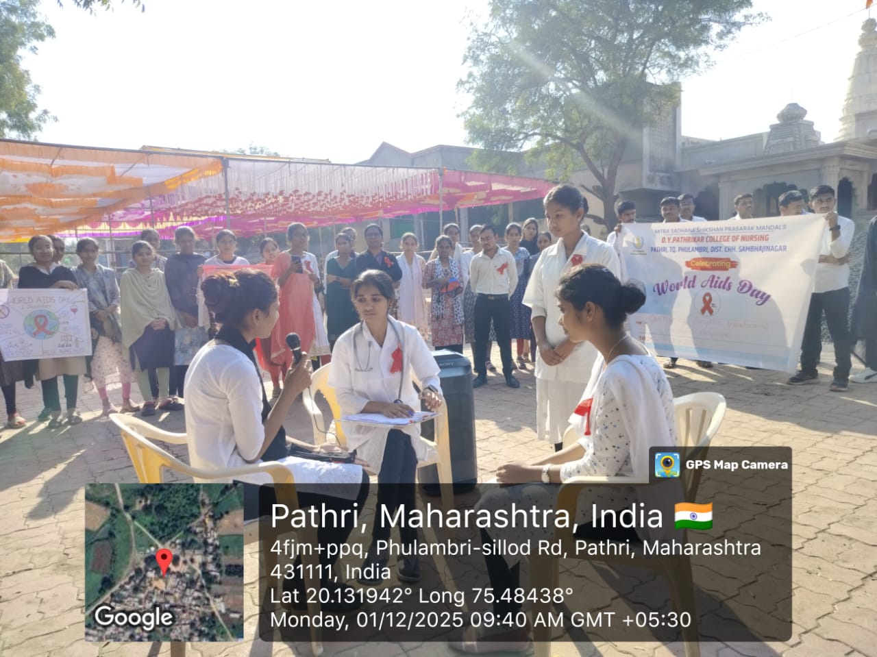 World AIDS Awareness Day was observed on 1st December by the nursing students of D.Y. Pathrikar college of Nursing, Pathri with the aim of creating awareness about HIV/AIDS among the rural population. The program began with a rally organized by the nursing students. Students carried placards and banners with meaningful slogans such as “Stop AIDS, Keep the Promise,” “Prevention is Better than Cure,” and “Say No to Discrimination.” The rally passed through the main streets of the village, attracting the attention of villagers and effectively spreading awareness.